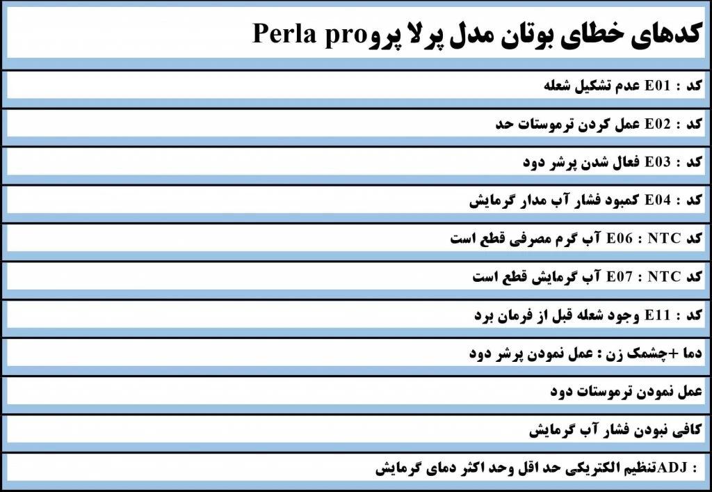 مصرف کنندگان عزیز شما می توانید جهت رفع عیب کدخطا پکیج بوتان Perlapro موارد ذکر شده در ذیل را مشاهده نموده و از مشکل پکیج خود مطلع شوید، در صورت مطالعه آموزش رفع کد خطا پکیج خود اگر جهت رفع کد خطا نتوانستید اقدامی انجام دهید با ما تماس حاصل نمایید تا در اسرع وقت جهت رفع مشکل پکیج شما اقدام نماییم.